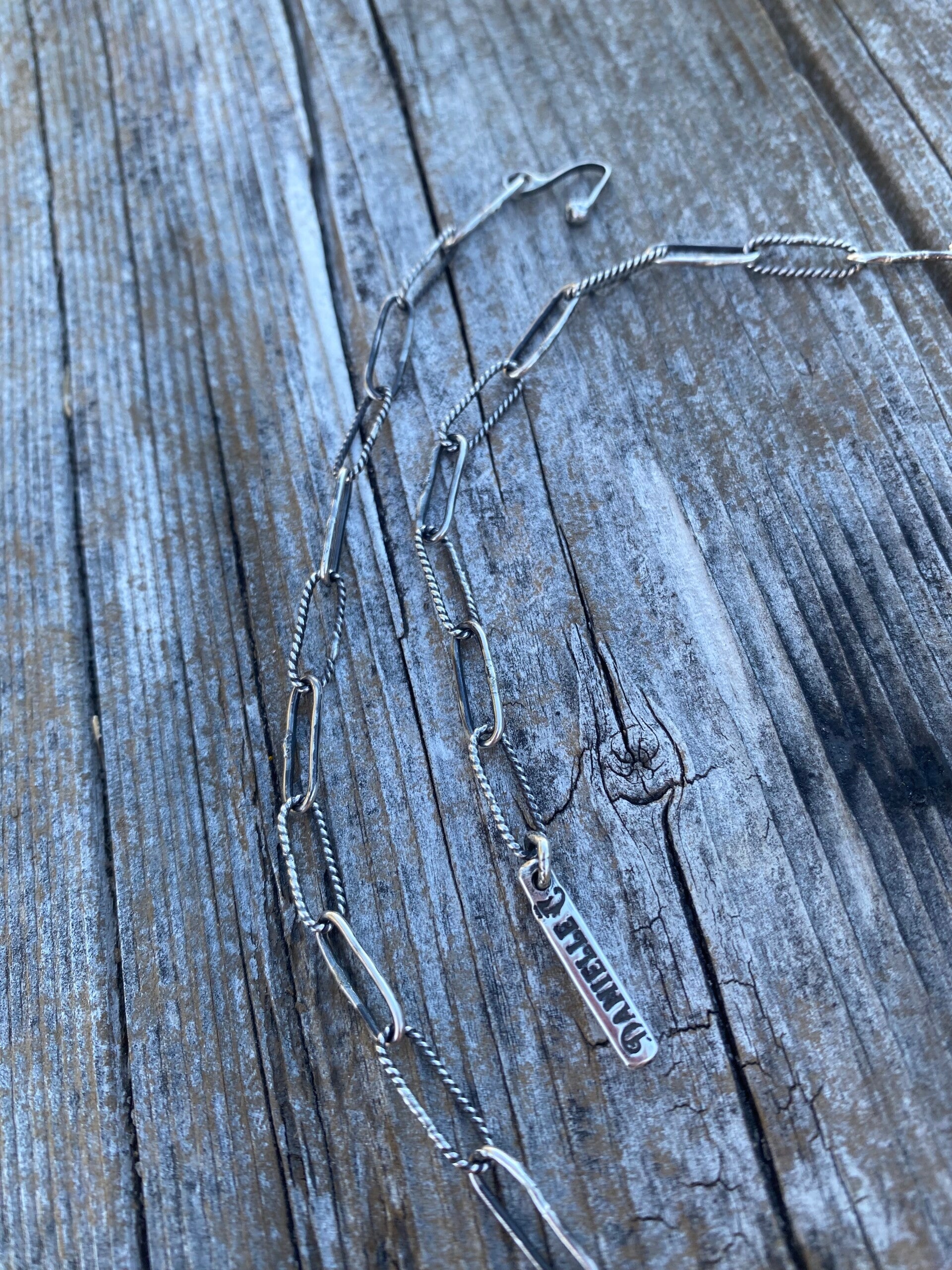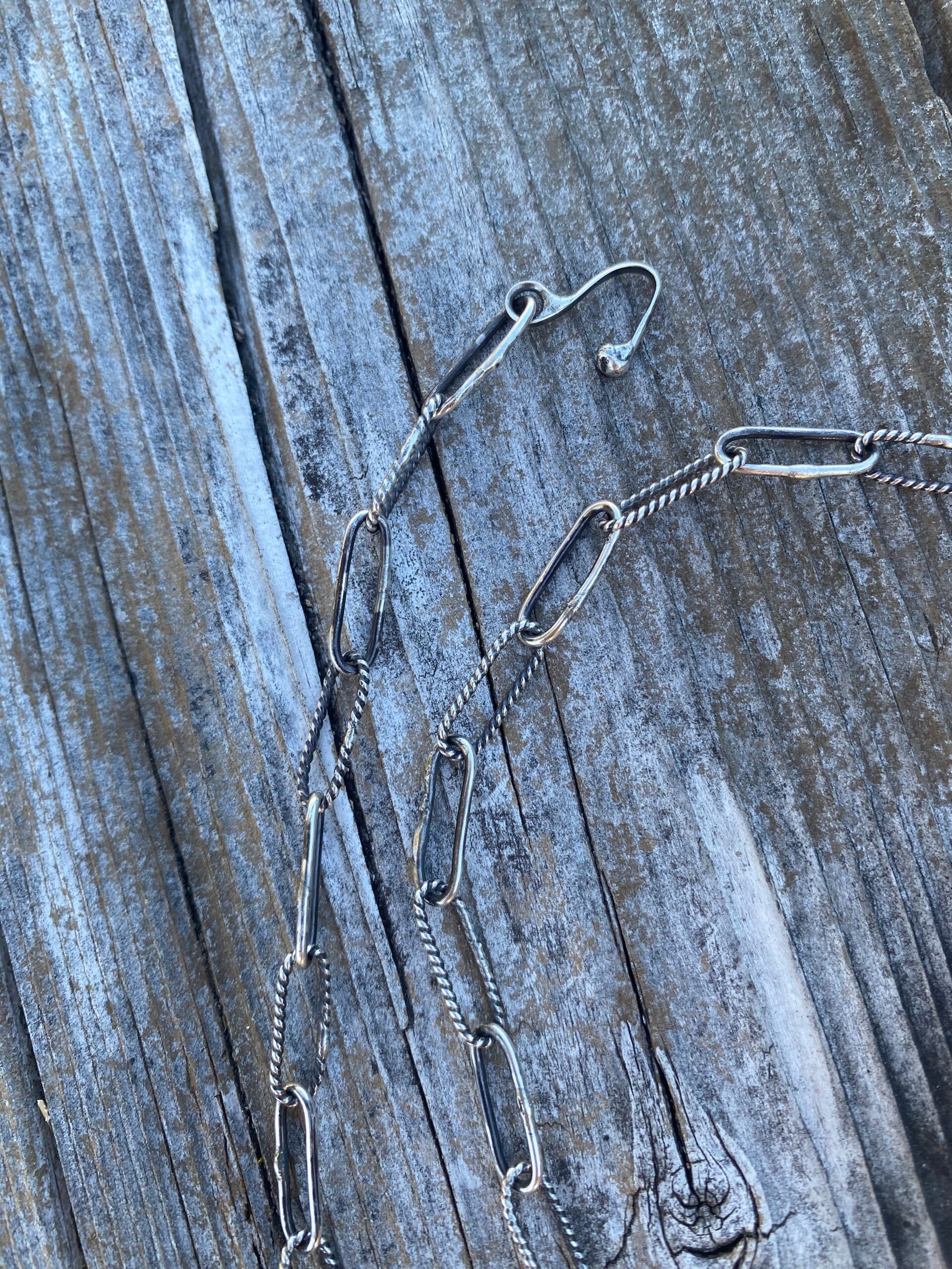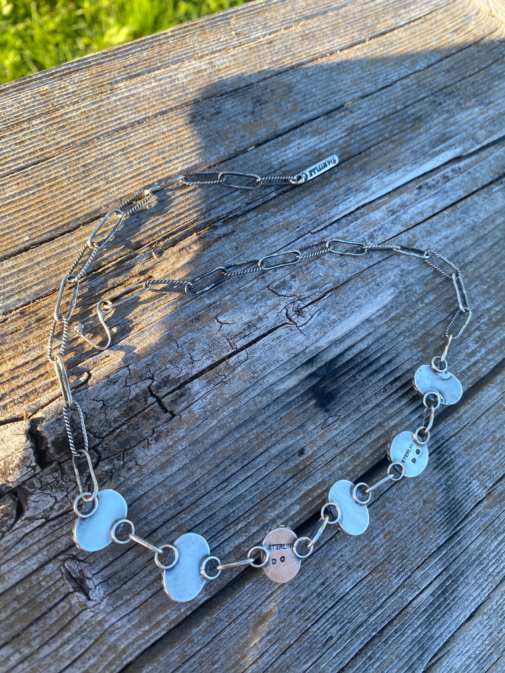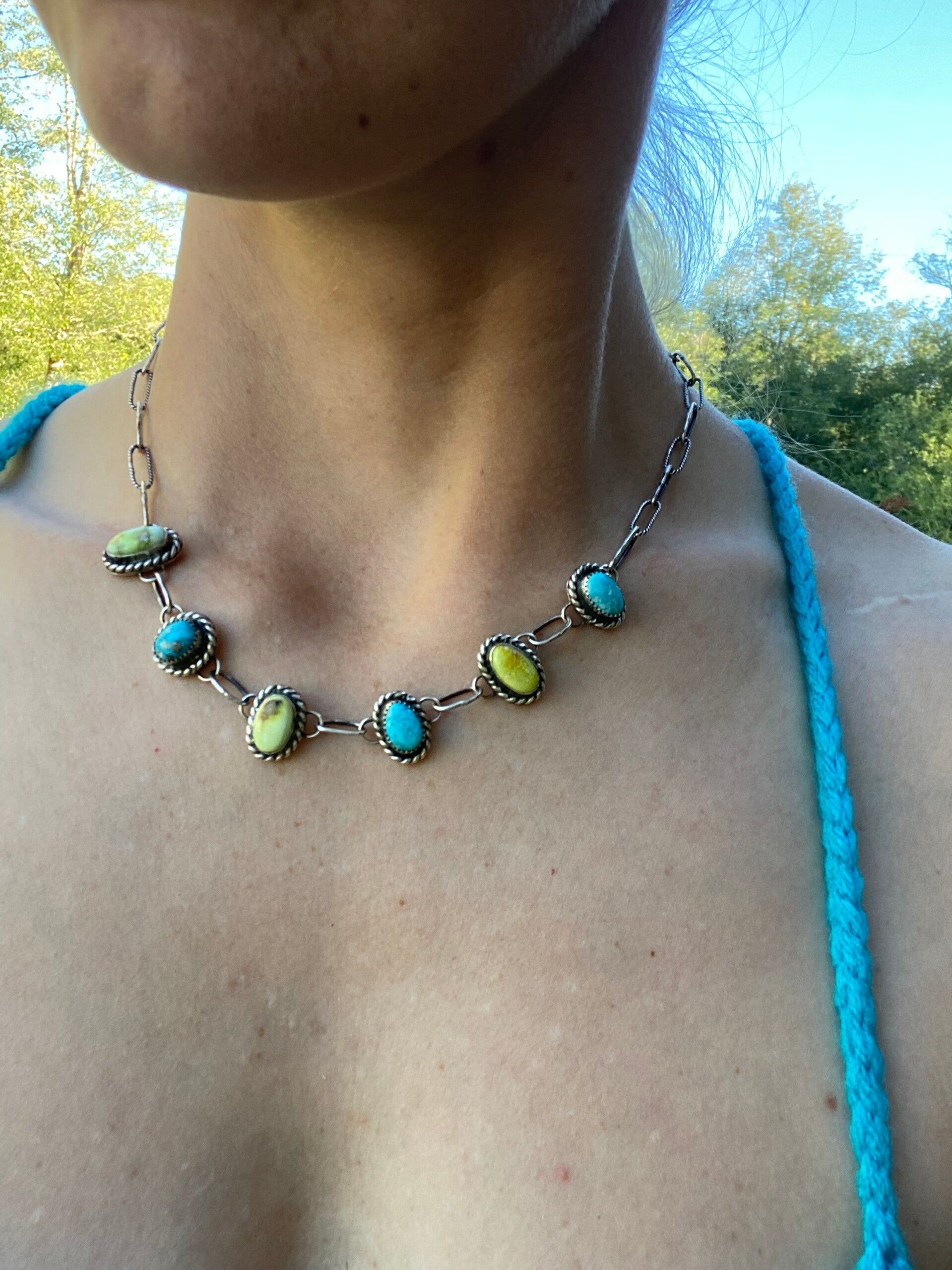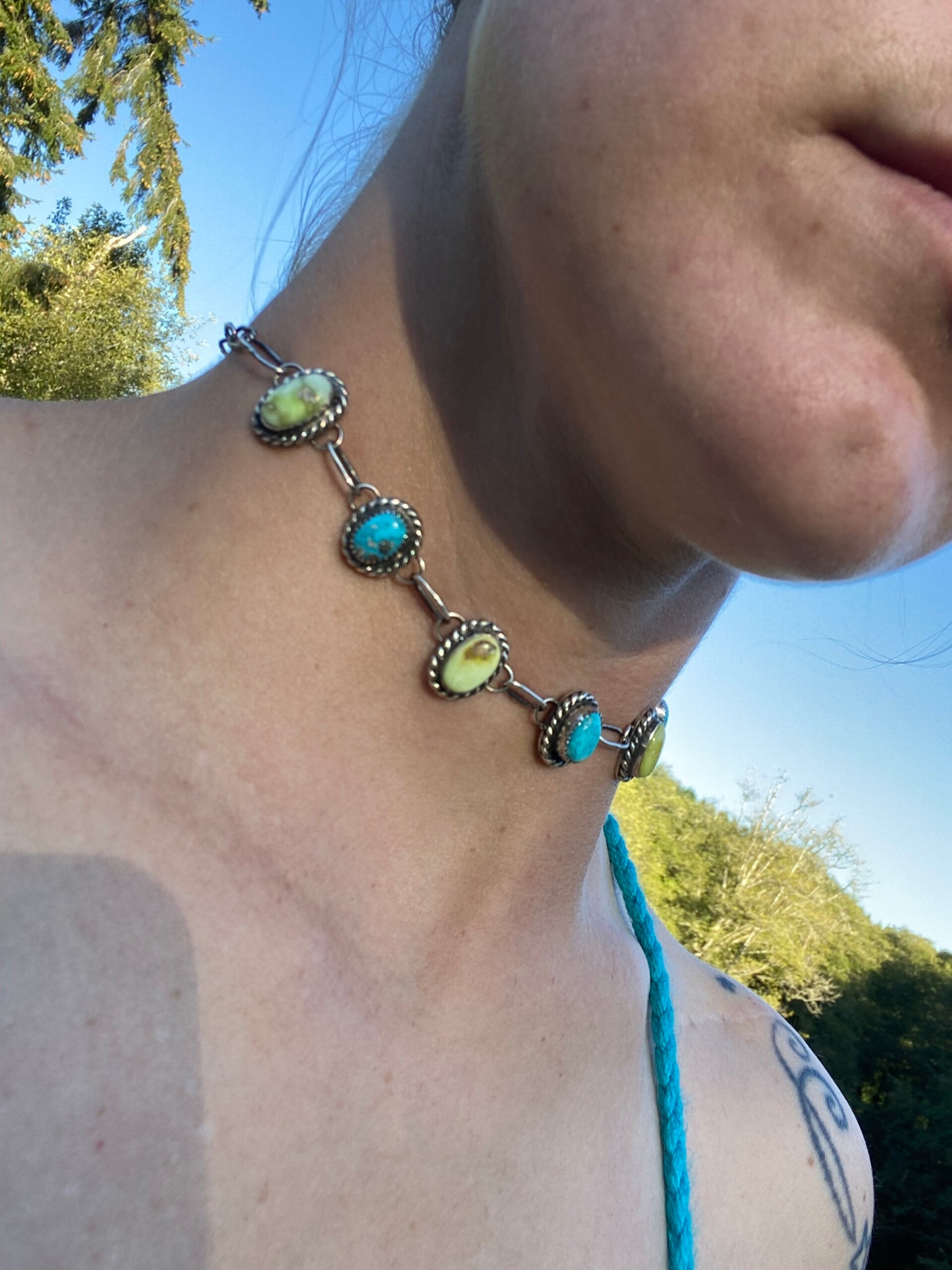 All sterling silver choker necklace. Every part of it is hand soldered by me, including the links. Genuine Palomino and Bluebird Turquoise. 18" long end to end but it is adjustable so it can be worn as a choker necklace. Signed on the back with my initials and my makers mark on a custom made tag.