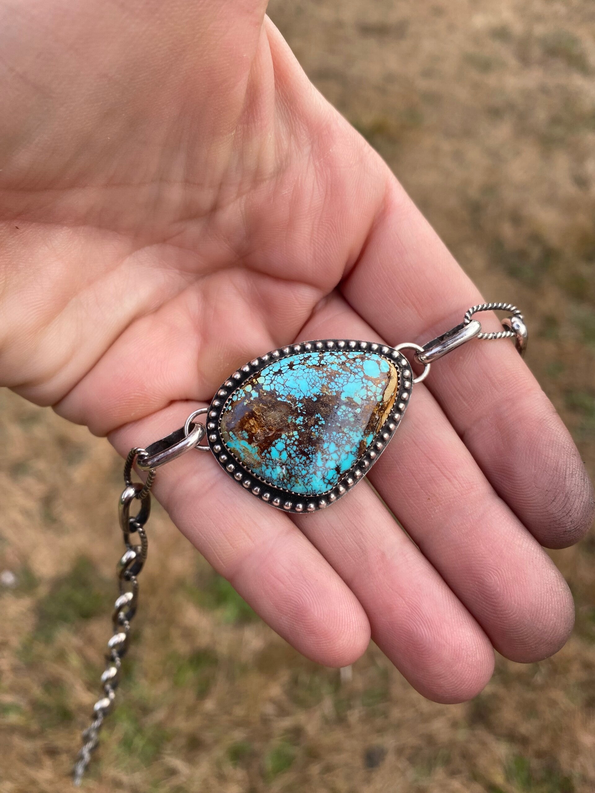 All sterling silver and all hand soldered by me. Every chain link and clasp made and soldered by me. 18.5" long end to end but is adjustable so it can be worn as a choker as well. Genuine Royston Turquoise stone.
