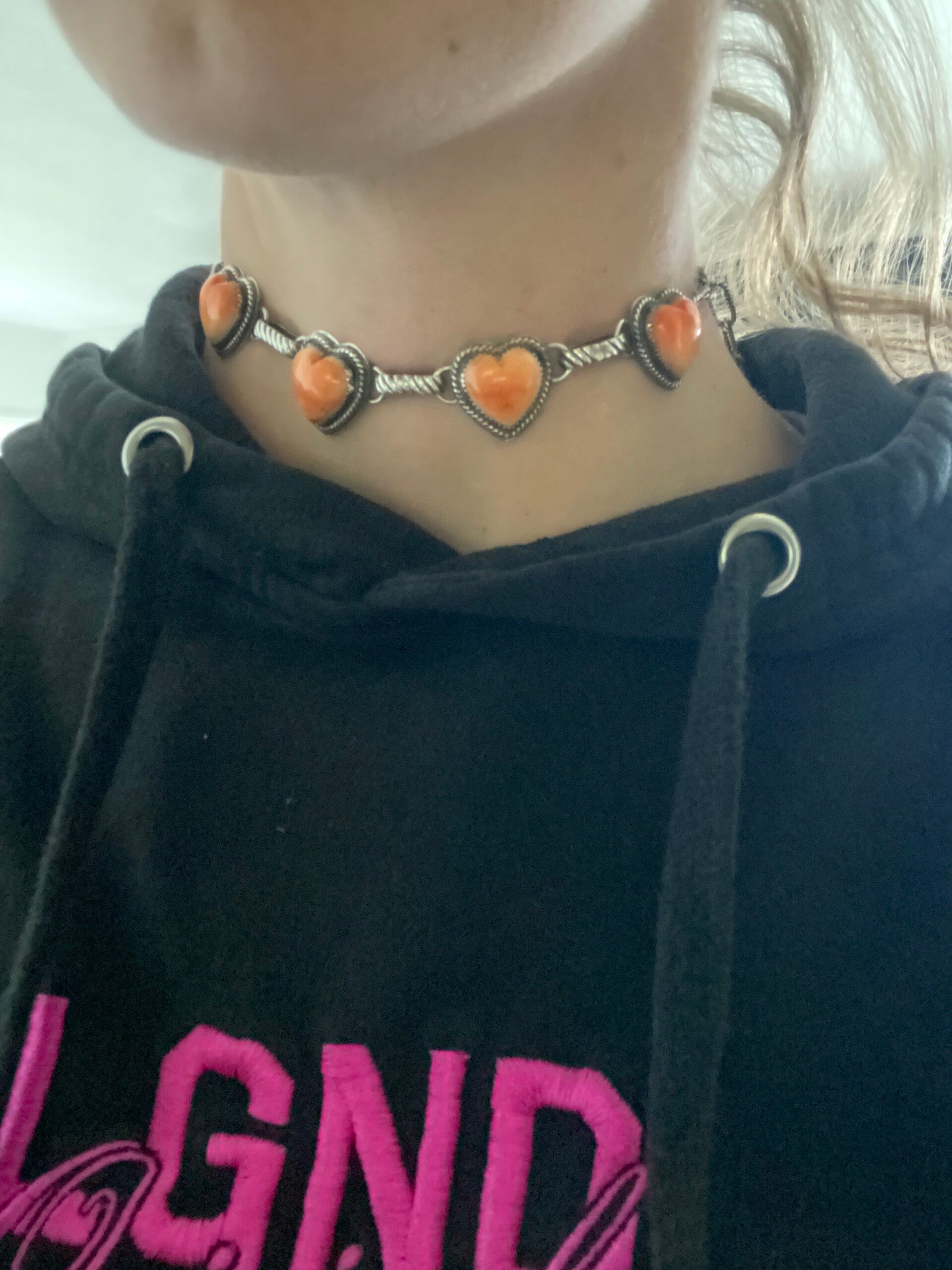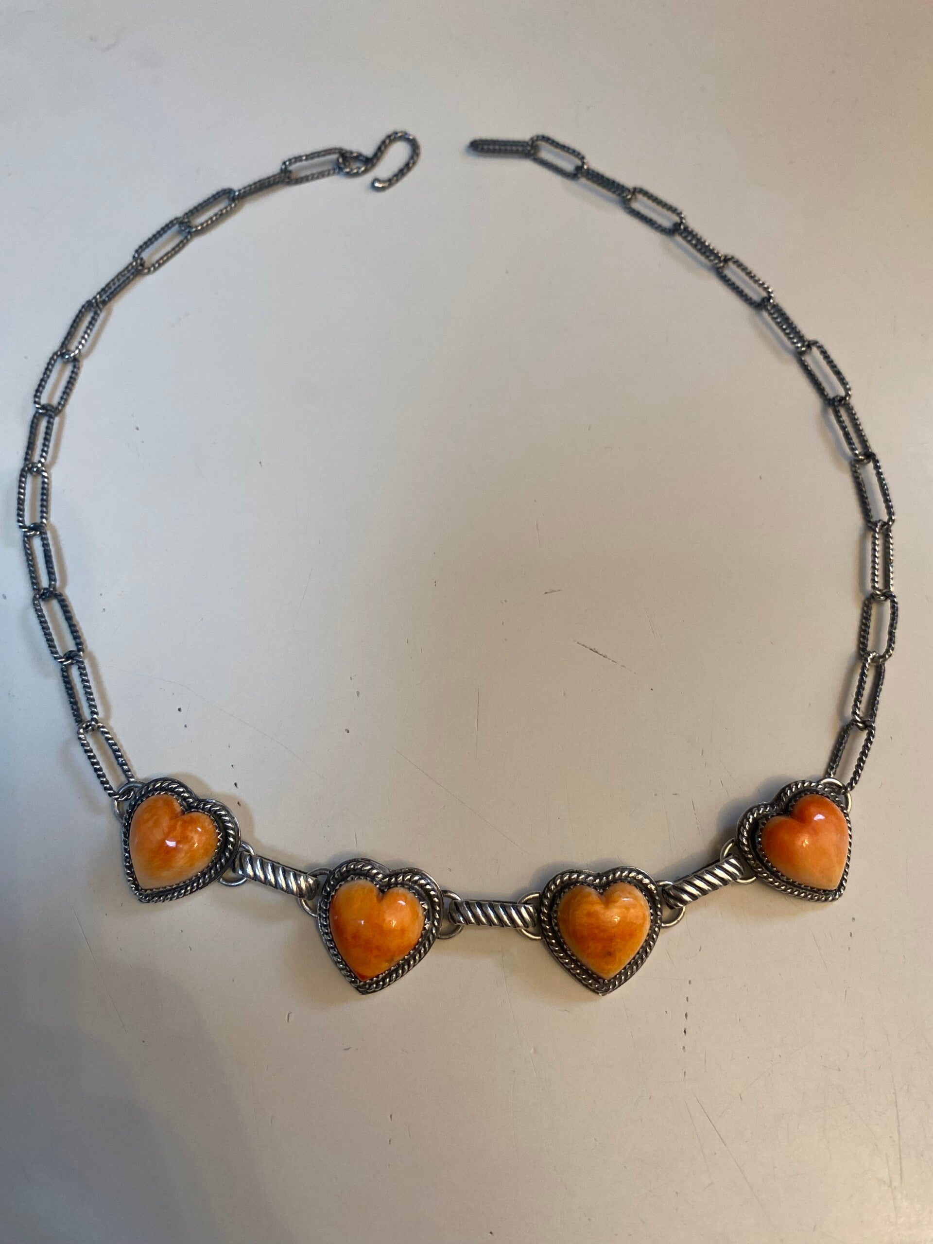 All sterling silver with some nice weight, that gives it a good quality feel. All soldered by me, every link and clasp. It is signed with my makers mark. I have the back a nice high shine. Genuine orange spiney oyster. The necklace is 18.5" long but it is completely adjustable so you can wear it long or as a choker. All custom and one of a kind🧡