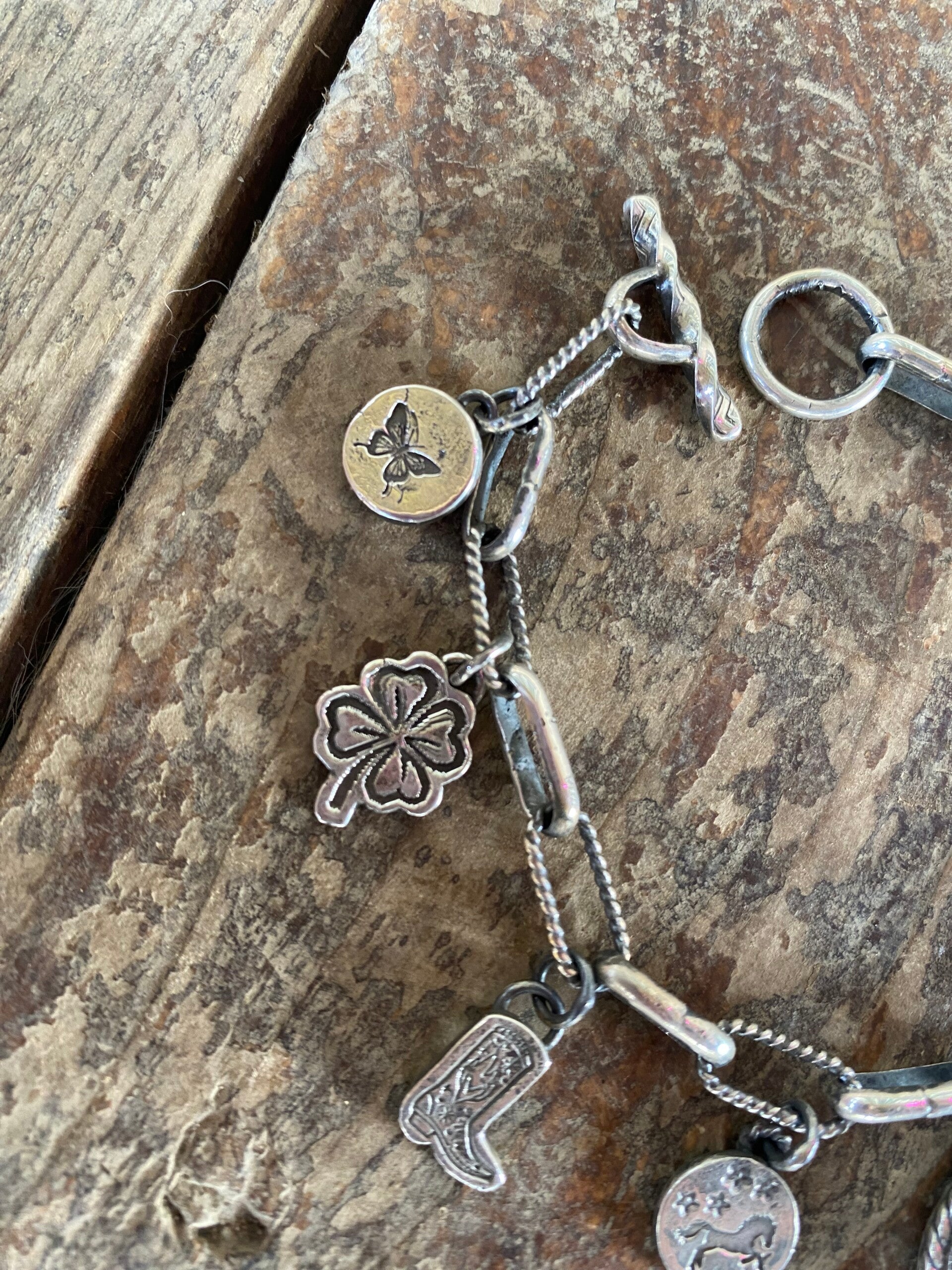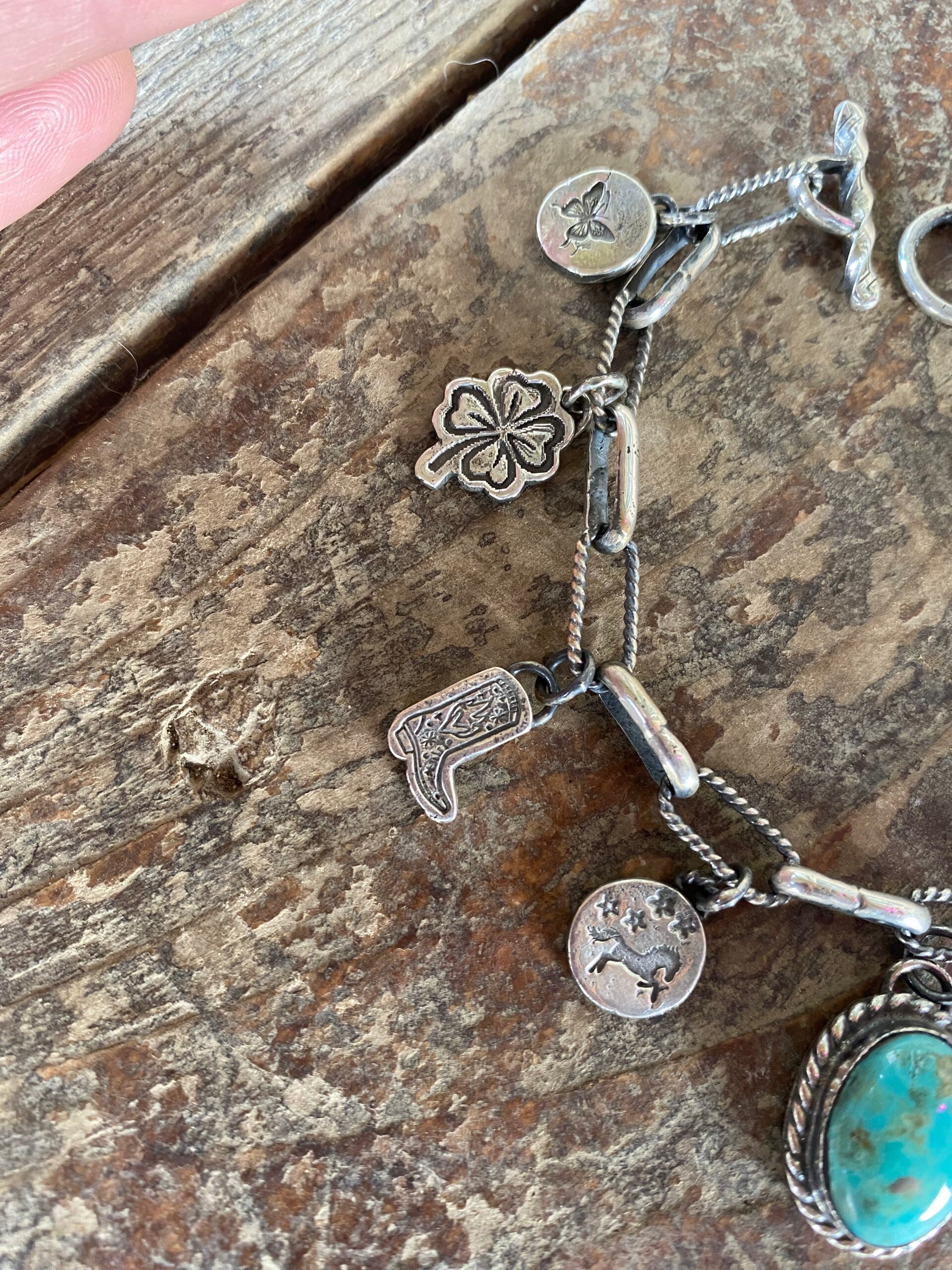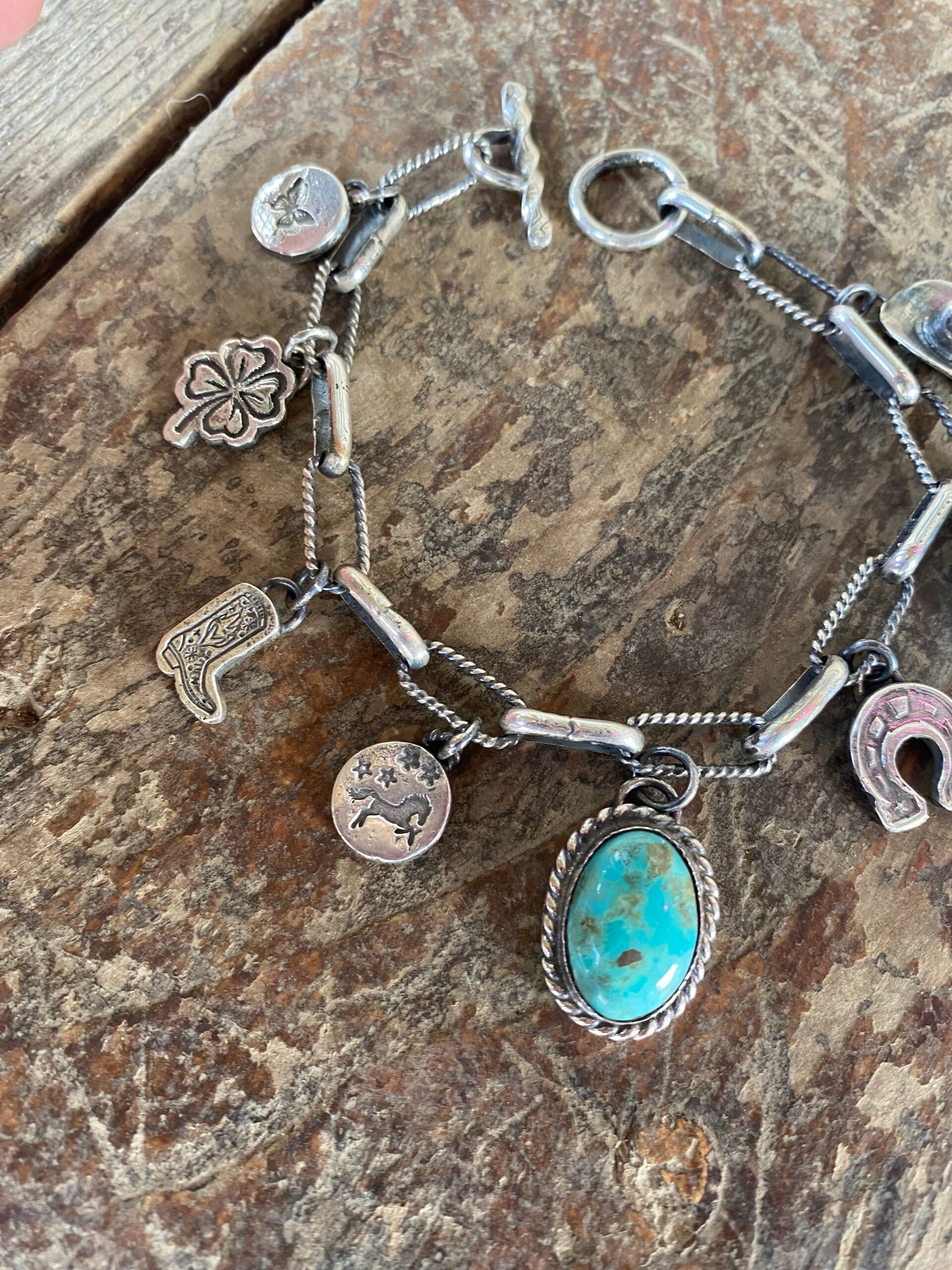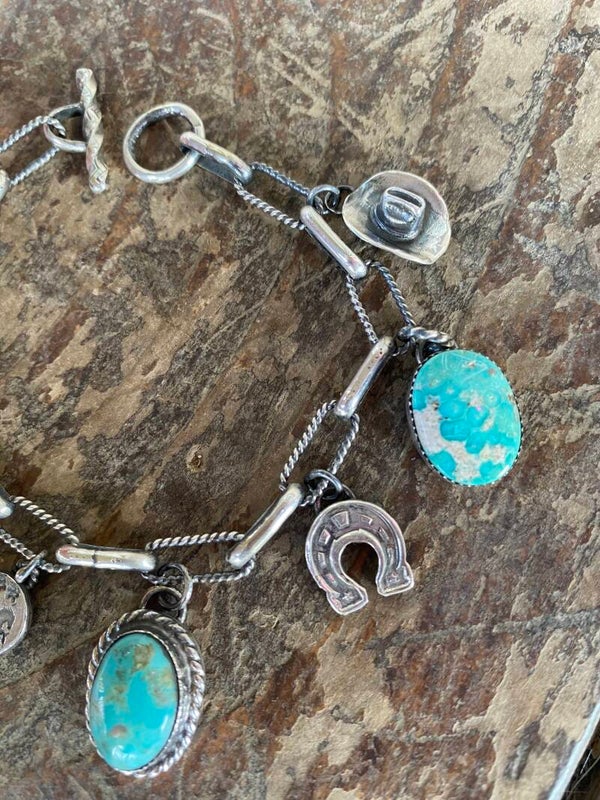 All handmade and all sterling silver. Everything is soldered on this bracelet. It is very nice quality and has a little weight. 7.5" long. Genuine Campitos Turquoise and Whitewater Turquoise rocks. Custom toggle clasp.