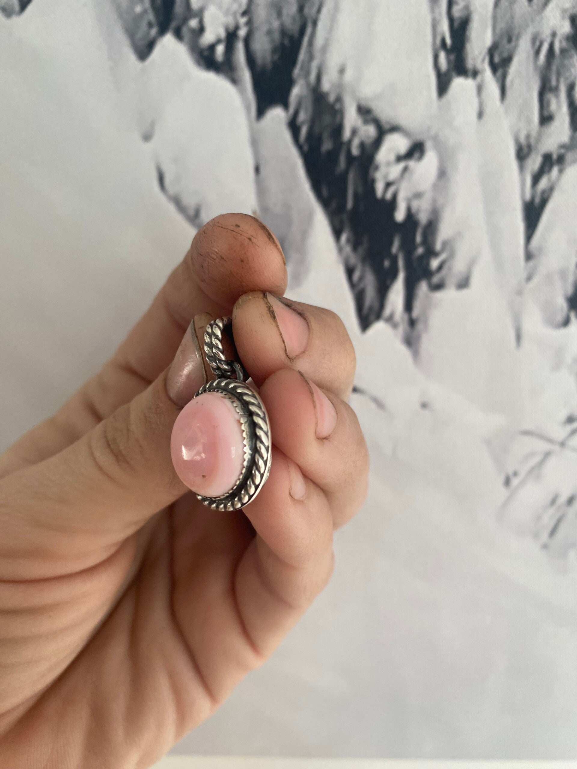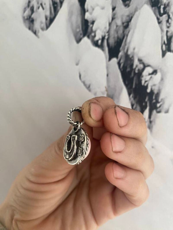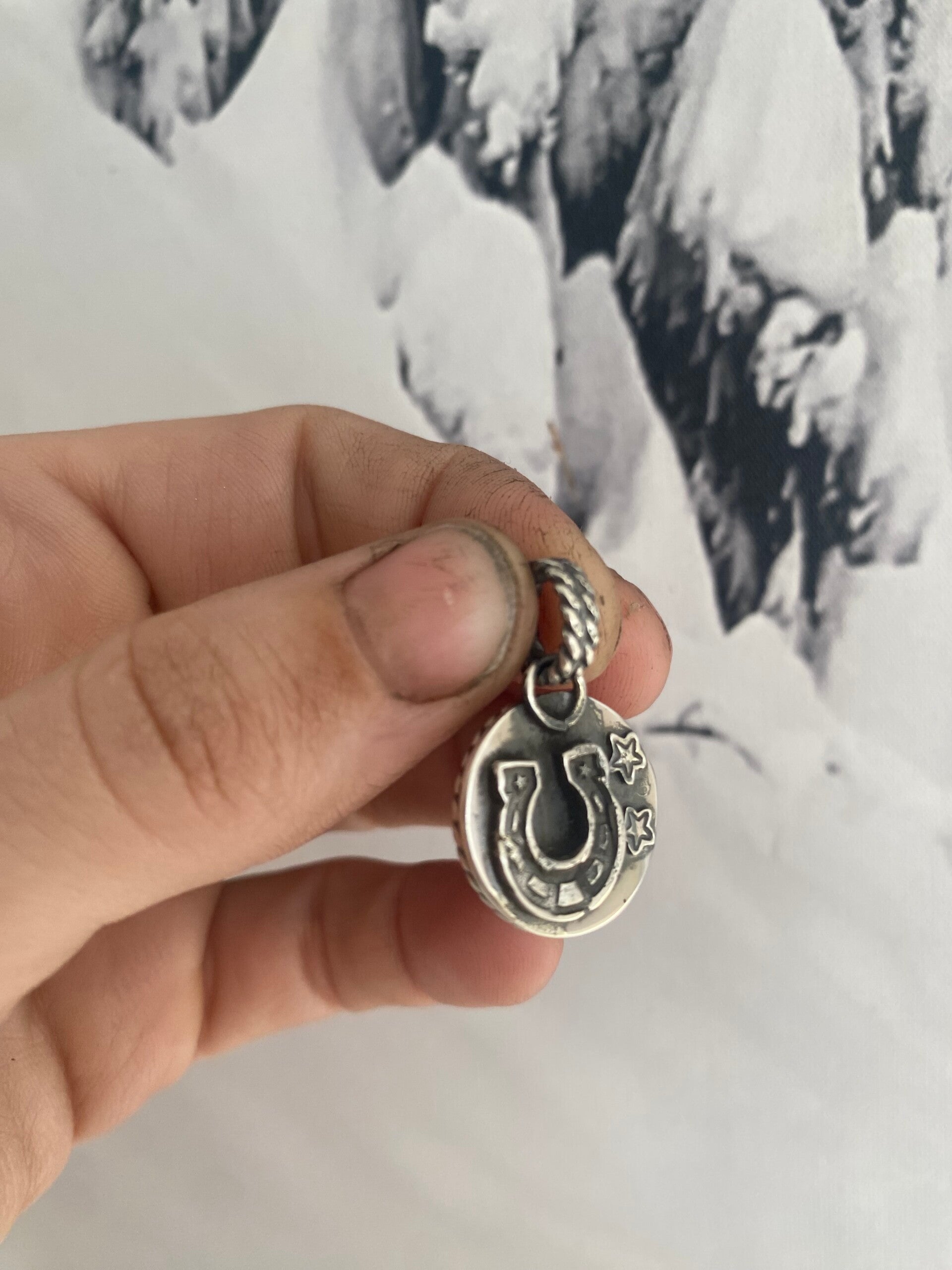 All sterling silver and a genuine queen conch piece. One side has the Sterling horse shoe and stars and the other side is set with a round pink Conch. You can wear it facing either side out. The bail fits up to 5mm beads. It is a very custom pendant made unique and beautiful.