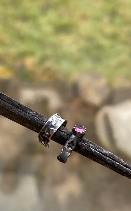 You will receive both ear cuffs made by me. Both sterling silver. Hand stamped and handmade. The stone set in the star cuff is a genuine pink Ruby. The other cuff is stamped mustangs.